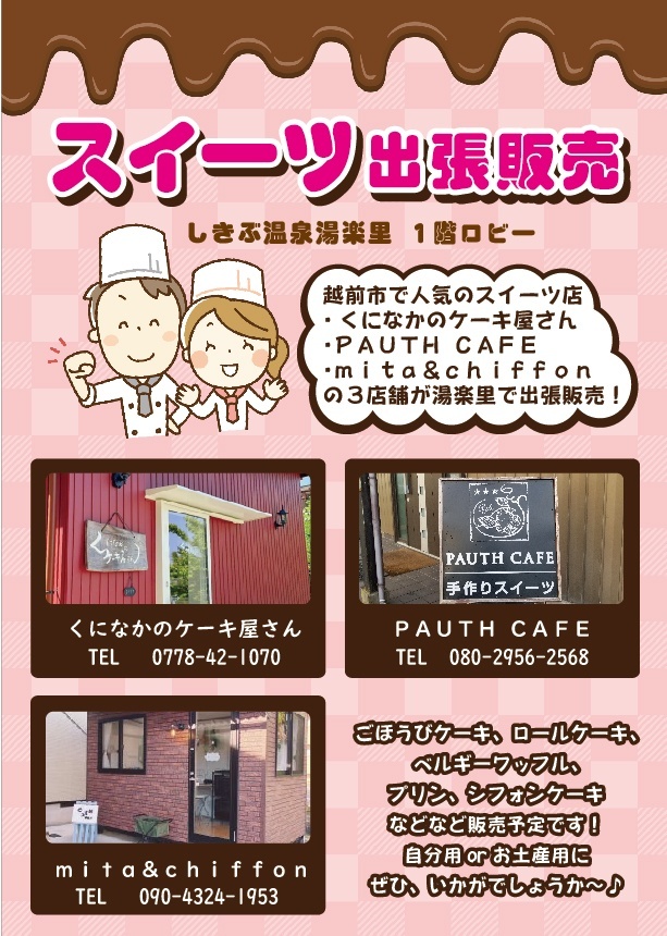月に一度のお楽しみ♪ 10月12日(日)14:00〜 1階ロビーにて、人気スイーツ店の出張販売を行います(๑ゝω╹๑) 越前市の人気スイーツ店3店舗が登場ଘ(੭ˊ꒳ˋ)੭✧ ・くになかのケーキ屋さん ・PAUTHCAFE(ポースカフェ) ・mita&chiffon それぞれの店舗が自慢のスイーツをご用意してくれます♪ 湯上がりに、贅沢な甘いひとときをいかがですか? 売り切れ次第終了となりますので、お早めにどうぞ!