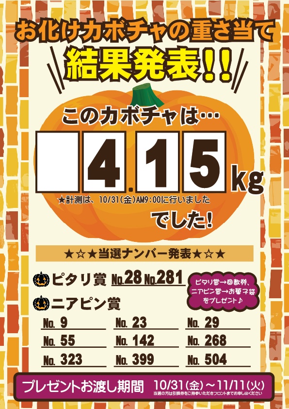 気になる【かぼちゃの重さ】と【当選番号】を発表します♪